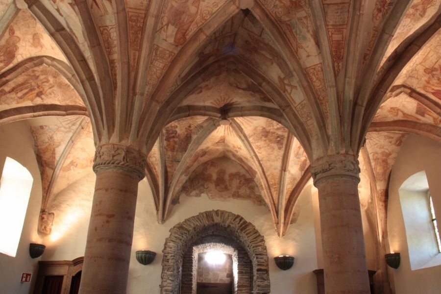 Als das Kirchlein im 10. Jahrhundert errichtet wurde, wurde es allen Heiligen geweiht. Erst ab dem 16. Jahrhundert wird hier der hl. Willibrord verehrt. Anfangs umfasste der Raum eine Fläche von nur 5 auf 10 m. Erst ab 1535 wurde der Bau mehrmals erweitert, sodass man heute noch die verschiedenen Bauepochen erkennen kann. Bei den zuletzt durchgeführten Restaurierungsarbeiten, wurde der Bodenbelag so gestaltet, dass man die Fundamente des ursprünglichen Baues erkennen kann. Ein Eisengitter erlaubt - zwischen Chor und Schiff - einen Blick auf die originalen Fundamente zu werfen. Erst 1952 wurden die Fresken neu entdeckt. Sie wurden freigelegt, gesäubert und in Stand gesetzt. Sind auch einige Bilder zerstört, so kann man doch die meisten Darstellungen als Ganzes wiedererkennen. Diese Malereien dienten nicht allein der Verzierung des Baus, sondern sollten den Gläubigen, besonders den Analphabeten, erlauben die wichtigsten Stellen der Bibel zu kennen.