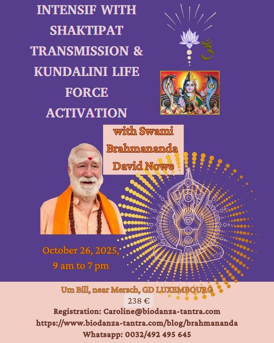 The workshop on Saturday, October 25th will be dedicated to the 7th Chakra, the workshop on Sunday, October 26th: Shaktipat Intensive with Brahmananda