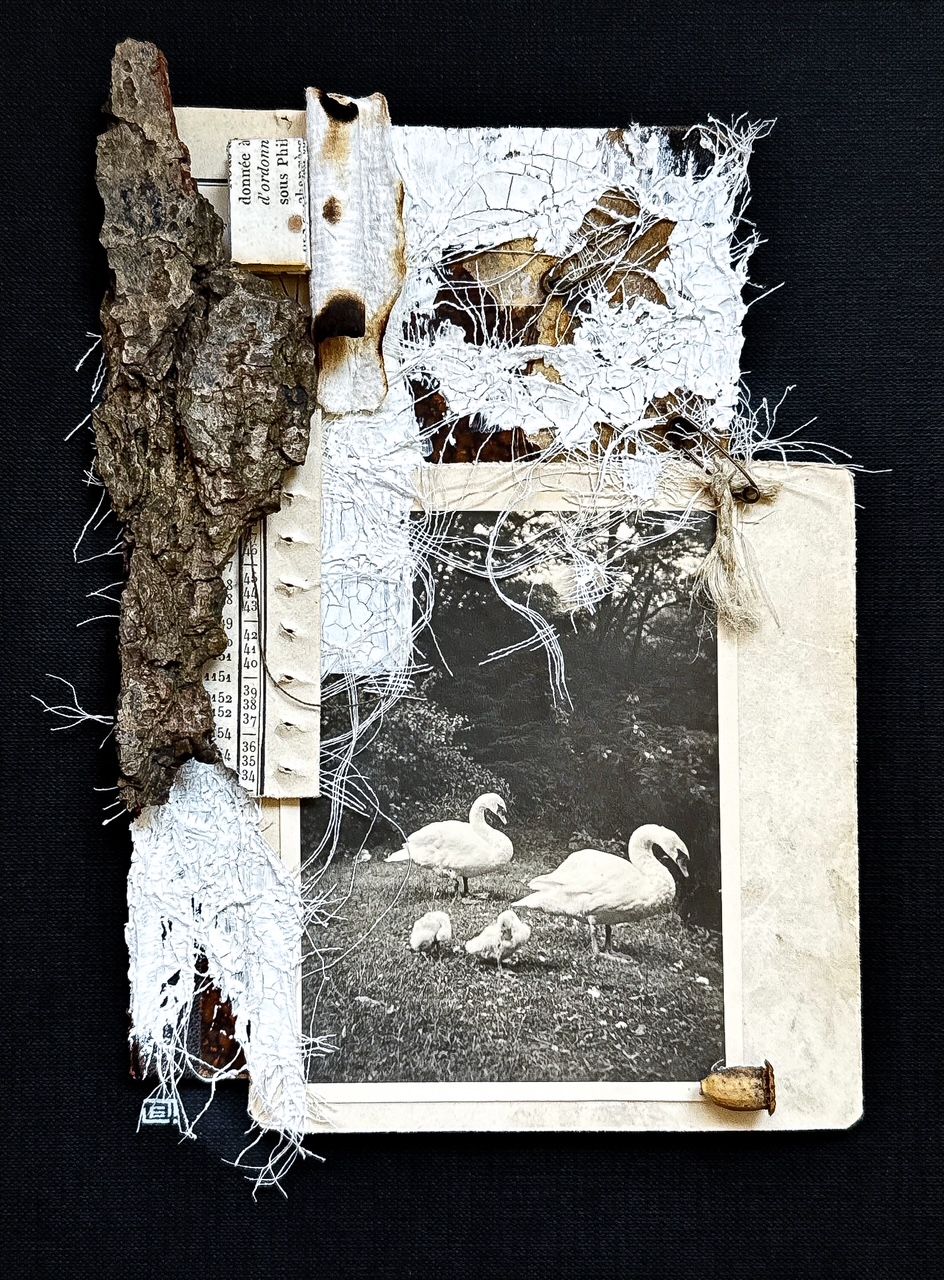 Estelle Lichtenberger-Froehling​’s artistic work falls within the realm of collage and assemblage, where she breathes new life into old materials: forgotten photographs, worn papers, handwritten letters, torn textiles. These fragments of the past – often considered worthless – are silent treasures to her. She collects them with care, guided by a sensitivity to the ephemeral, the worn and the invisible stories they carry within them. In her compositions, Estelle assembles these elements in an intuitive, poetic and sometimes fragile way. Each work becomes a space for memory and reverie, an attempt to hold on to what is disappearing.