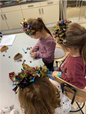 The children use various materials, textures, and colors to create their own Christmas crown that reflects their personal taste.
