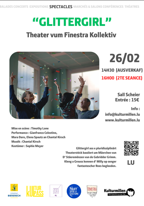 Glittergirl ass e pluridisziplinär Theaterstéck baséiert op D’ Stäeremënzen vun de Gebridder Grimm. Dat jonkt Milly fënnt verschidden, interessant Objeten am Bësch, mee hatt hellt se net fir sech eleng mee deelt se oder gëtt se u Leit weider déi se villäicht méi brauchen ewéi hatt. Hatt hëlleft dem léiwe Fränz deen Honger huet a keen Doheem méi huet mee hatt muss oppassen dass dat strengt Ginette et net mierkt. Befanne mir eis an dem Milly senger Dramwelt oder ginn et déi Personnagë wierklech? Kleng a Grouss kennen d’ Milly op senger fantastescher Rees begleeden. D’ Milly weist eis dass et wichteg ass empathesch ze sinn a Matgefill ze hunn an eiser hautdesdaags echbezunner Gesellschaft an dass een d’ Kanner soll dreeme lossen.