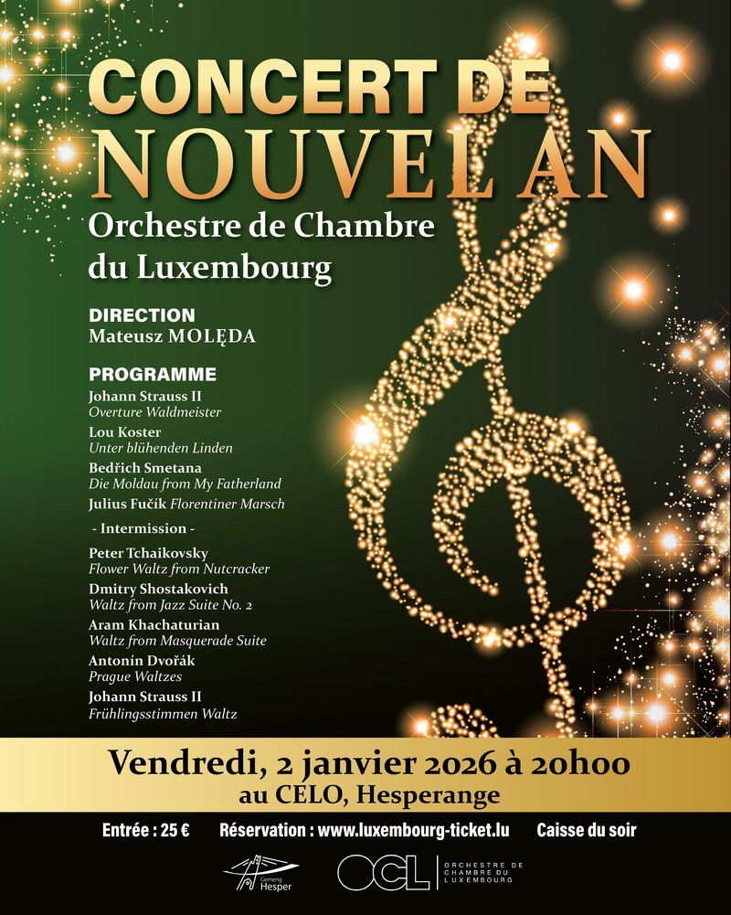 Quand ? Vendredi 02.01.202620:00 Concert Nouvel An Où ? 476, route de Thionville, L-5886 HESPERANGE Festivals de musique Orchestre de Chambre du LuxembourgInformations sur les prixA partir de 1,50€Réserver un billetA partir de 1,50€©echo.luDates des prochains événementsVendredi 02.01.202620:00