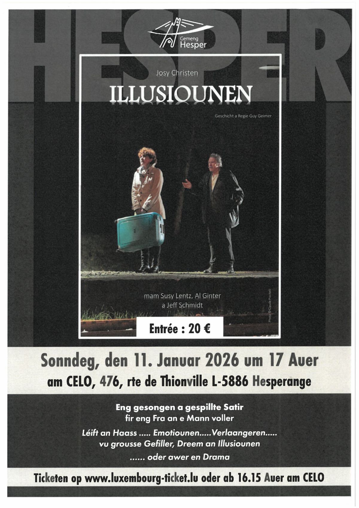 Quand ? Dimanche 11.01.202617:00 ILLUSIOUNEN Où ? 476, route de Thionville, L-5886 HESPERANGE Festivals de musique gesongen a gespillte SatirInformations sur les prixA partir de 1,50€Réserver un billetA partir de 1,50€©echo.luDates des prochains événementsDimanche 11.01.202617:00