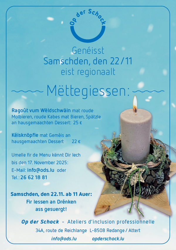 Inscription pour le menu jusqu'au 17 novembre 2025 à l'adresse : í ½í³§ info@ods.lu í ½í³ž 26 62 18 81
