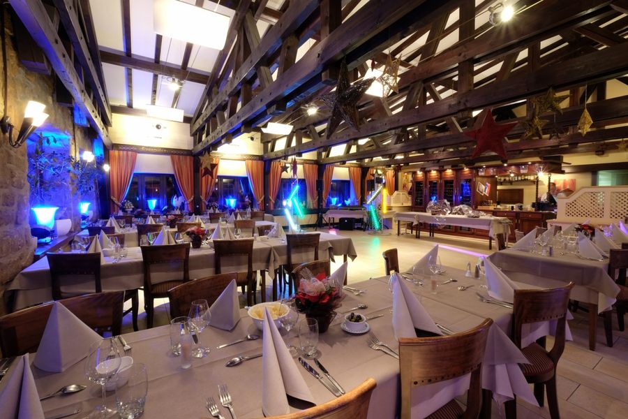 Grande terrasse d 'été. Salle de banquets climatisée pouvant accueillir jusqu à 148 personnes.