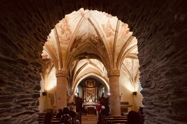 Visite guidée de l'église Saint-Willibrord (Xe siècle) à Rindschleiden, qui est remarquable par ses fresques du 15e et 16e siècle.
