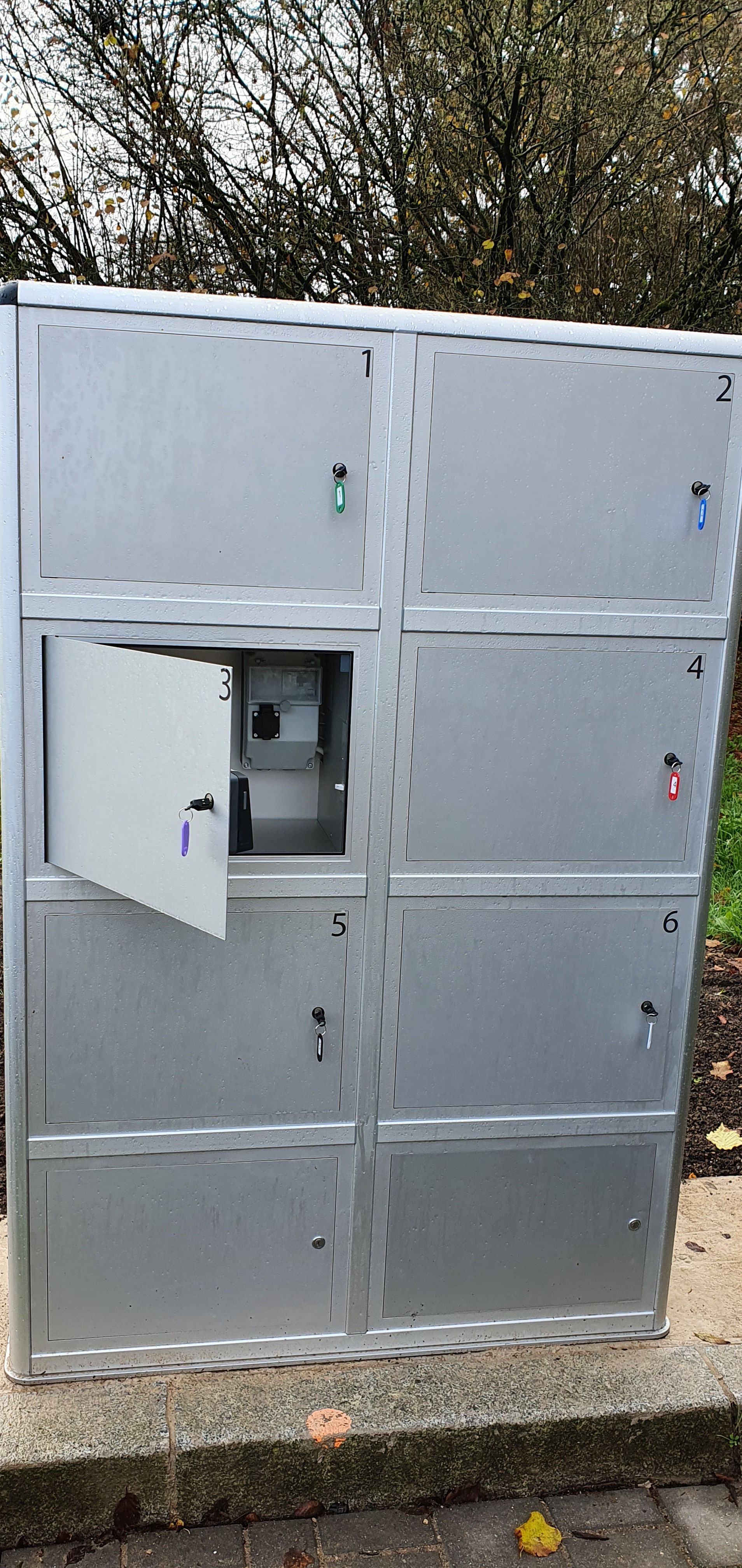 6 storage boxes for bicycles and 6 charging compartments for e-bike batteries.