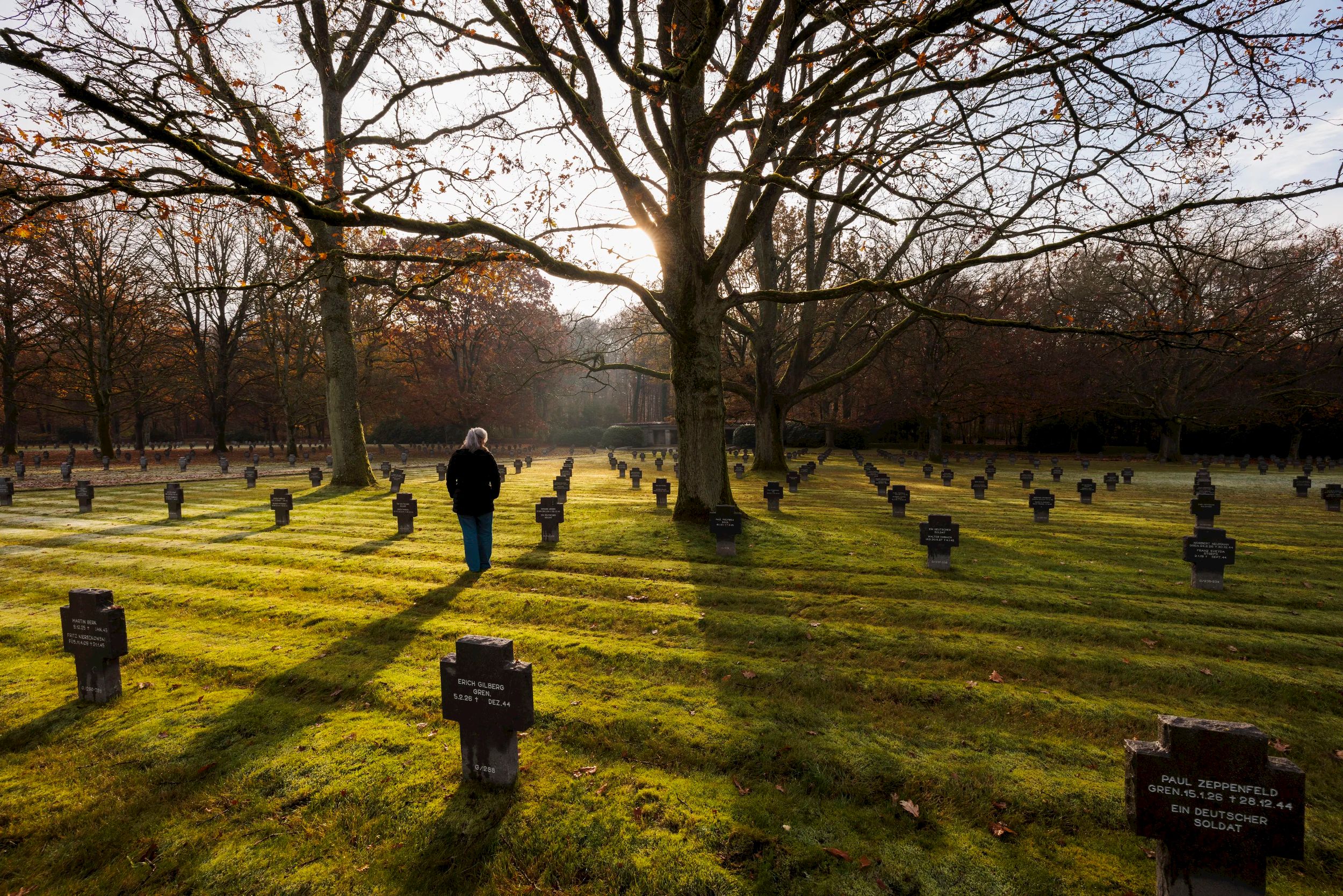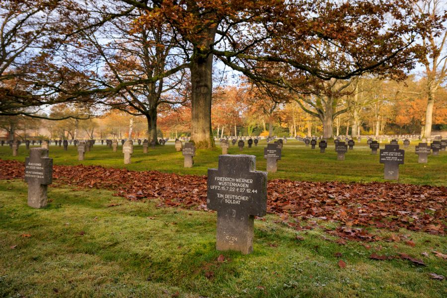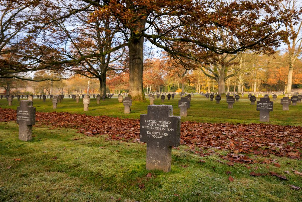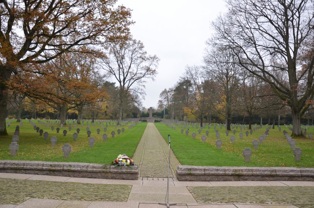The German military cemetery Sandweiler houses 10,913 graves of German soldiers who fell mainly during the Battle of the Bulge in the winter of 1944/45 in the Ardennes and the eastern border areas of Luxembourg. 4,829 soldiers are buried in the mass grave "Kameradengrab" under a large black native "Eifel" lava cross. Their names are cast on bronze plaques arranged in a circle around the central cross. The German cemetery in Sandweiler belongs to the German War Graves Commission and is in striking contrast to the nearby Luxembourg-American cemetery in terms of design and construction.