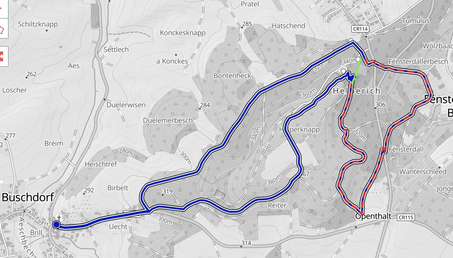 We walk through the town in western direction, through the forest and uphill towards the Helperknapp. The route leads down to Obenthalt. We walk past the hamlet Fënsterdall to the Roman tumulus. We go along the slopes of the Helperich and return to the starting point.