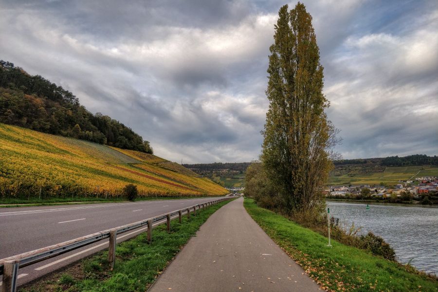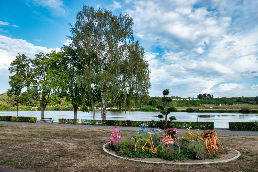 Detour to Schengen (about 20km round trip): We follow PC3 on the banks of the Moselle upstream to Schengen. This bike path runs along the "route du Vin" (CR152), which leads out of the town and past Schwebsange to Remerschen. Here you can turn off to the nature reserve "Haff Reimech" and reach the leisure gravel pit lake. A visit to the nature preservation center "Biodiversum" is worthwhile, and opposite you can swim or take a break in the restaurant. Also, the youth hostel in Remerschen is certified with the "bed+bike" label and thus offers a nice place to stay overnight. The bike path continues to Schengen, where you can find information about the "Schengen Agreement" in the European Museum.